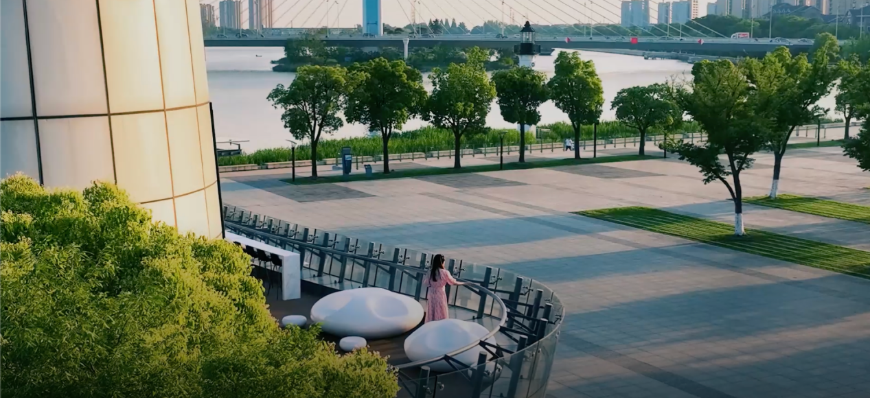 建筑緊鄰雙運(yùn)河水岸,整體以玻璃幕墻圍合,形成水岸上的游輪造型。門前廣場(chǎng)為市民提供漫步、會(huì)談的場(chǎng)所,二樓露臺(tái)布置云朵狀座椅,在加強(qiáng)室內(nèi)外聯(lián)系的同時(shí),生動(dòng)詮釋運(yùn)河水岸人與自然和諧共處的生活場(chǎng)景。